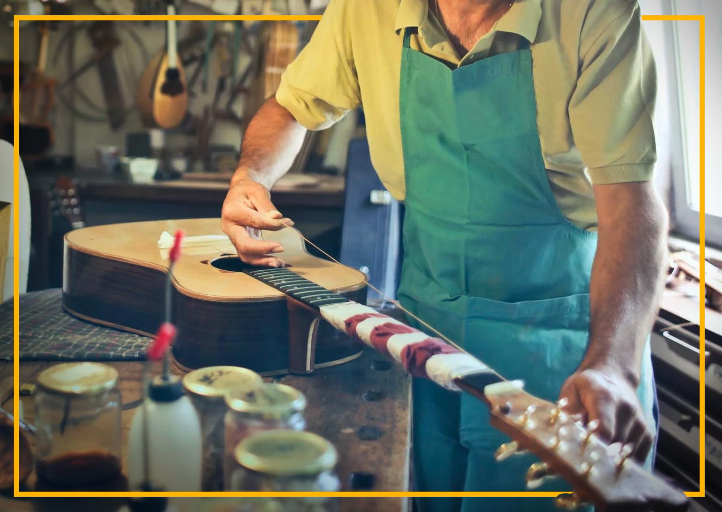 These guitars all get a clinical "bath". I remove the strings and the tuners, along with the nut and saddle, and polish the guitars. During this phase I repair and note any cosmetic and harmonic flaws and repair these. I replace the saddle and nut with bone (usually), and put light gauge strings on. Repairing cosmetic imperfections while still maintaining an affordable price is the greatest challenge. They all are playable.